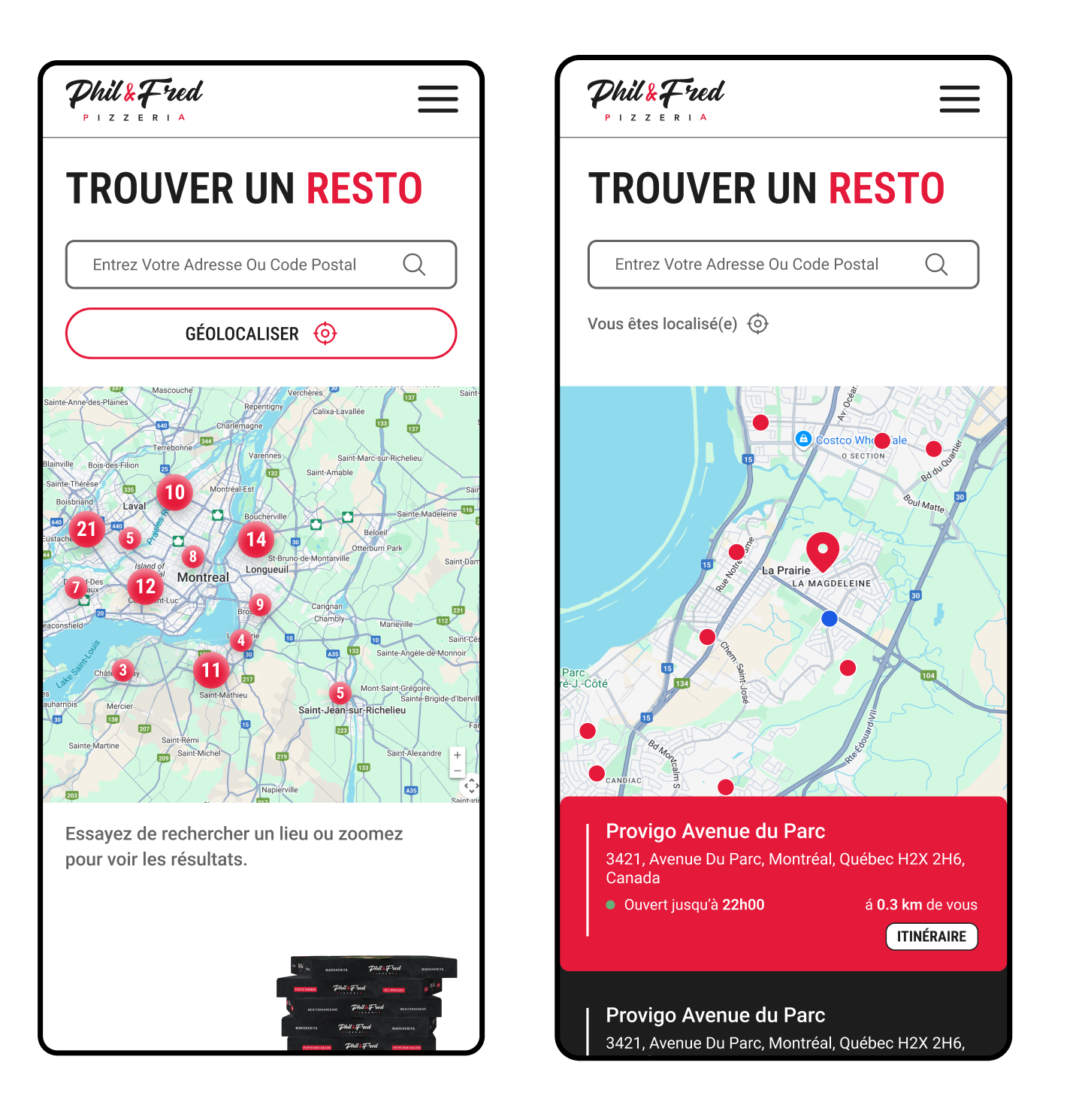 A Starbucks lokátor megoldásából kiindulva egy térképes boltkeresőt terveztem, ahol a felhasználó gyorsan megtalálhatja a legközelebbi Phil&Fred pizzériát. A funkció geolokáció alapján automatikusan ajánl találatot, de manuális keresésre is lehetőséget ad.